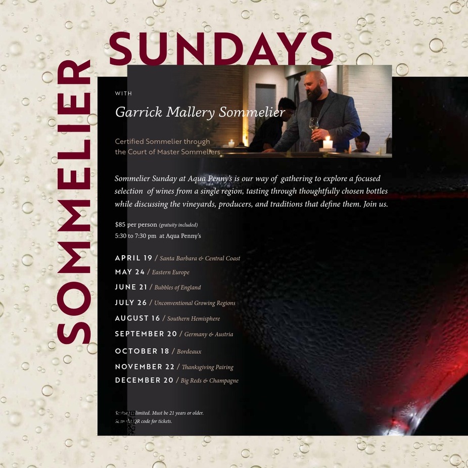 Join us at Aqua Penny's for a classroom and small bites with Sommelier Garrick Mallery,
